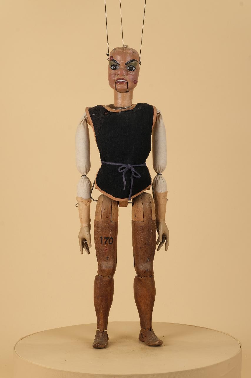 Testa in legno di tiglio fissata al corpo tramite un perno in ferro; occhi in vetro; bocca mobile; corpo normale in pioppo tagliato; snodo in vita ad anello rivestito in tela; gambe attaccate con ferro al bacino; ginocchia ad incastro; piedi mobili, piombati; mani in tiglio mobili e a dita separate. Bilancino originale a croce metodo Holden.