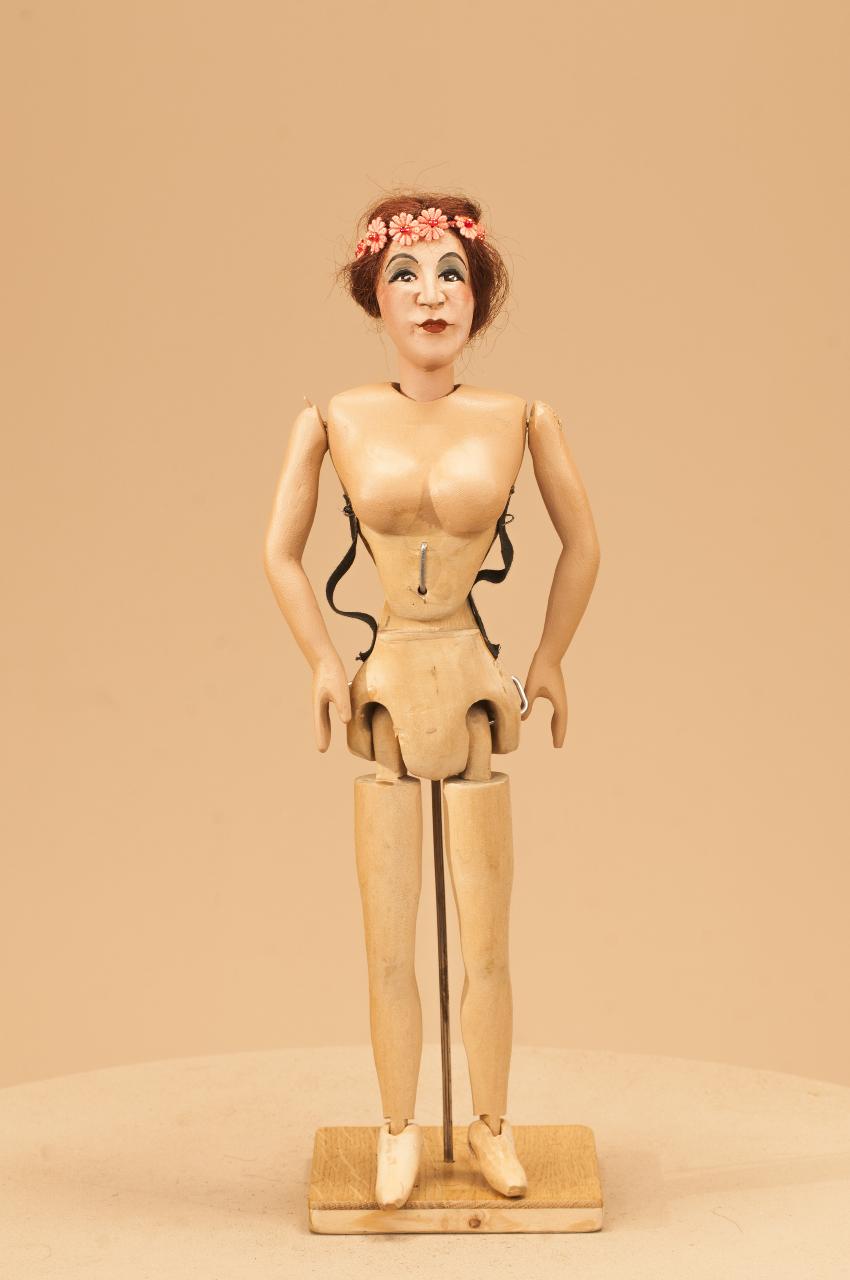 Marionetta interamente scolpita in legno di tiglio, con gambe, braccia e busto articolati mediante perni e leve in ferro. L'intera scultura è dipinta con colori acrilici. Il volto, definito nei tratti scultorei e pittorici, è rifinito mediante l'applicazione di un'acconciatura costituita da una parrucca in capelli veri ed una coroncina di fiori in tessuto di cotone. La marionetta è pensata per essere montata su una stanga e mossa, in serie ad altre copie simili, dalla quinta.