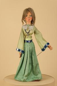 Questo burattino è una figura femminile in abito verde.