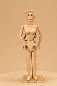 Marionetta interamente scolpita in legno di tiglio, con gambe, braccia e busto articolati mediante perni e leve in ferro. L'intera scultura è dipinta con colori acrilici. Il volto, definito nei tratti scultorei e pittorici, è rifinito mediante l'applicazione di un'acconciatura costituita da una parrucca in capelli veri ed una coroncina di fiori in tessuto di cotone. La marionetta è pensata per essere montata su una stanga e mossa, in serie ad altre copie simili, dalla quinta.