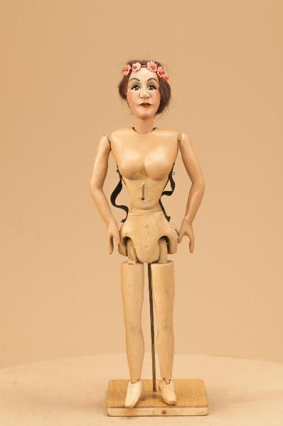 Marionetta interamente scolpita in legno di tiglio, con gambe, braccia e busto articolati mediante perni e leve in ferro. L'intera scultura è dipinta con colori acrrilici. Il volto, definito nei tratti scultorei e pittorici, è rifinito mediante l'applicazione di un'acconciatura costituita da una parrucca in capelli veri ed una coroncina di fiori in tessuto di cotone. La marionetta è pensata per essere montata su una stanga e mossa, in serie ad altre copie simili, dalla quinta.