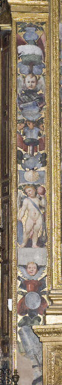 - NOTIZIE STORICO CRITICHE La seconda cappella del lato destro dell'Incoronata è dedicata a San Giovanni Battista e i primi affreschi con le "Storie del Battista" furono eseguiti da Giovanni e Matteo della Chiesa nel 1493 poi strappati e oggi al Museo civico di Lodi. L'ornamentazione della stessa viene quindi affidata nel 1530 circa alla famiglia Piazza, in modo particolare a Callisto coaudiuvato dai fratelli Cesare e Scipione, terminandola nel 1532, quando gli affeschi furono stimati dal pittore Gian Giacomo Trezzi. Le due lesene e le paraste che la racchiudono presentano, lungo un asse centrale, coppie di putti, teste, scudi disposti simmetricamente e speculari intervallati da targhe, vasi, strumenti vari, animali, teste e cartigli secondo una struttura chiaramente ispirata a quelle delle candelabre dell'altare. La trabeazione soprastante vede invece numerosi putti che giocano con capre. Questi motivi, seppur rielaborati, ricordano le grottesche che si erano ampiamente diffuse grazie agli allievi di Raffaello anche se nel corso del tempo avevano perso gli aspetti più fantasiosi a favore dell'introduzione di alcune costanti: i putti e elementi naturalisticamente riconoscibili. La confraternita dell'Incoronata e i Piazza dimostrano, quindi, di essere estremamemente aggiornati sulle novità artistiche, imprimendo al tempio lodigiano, primo fra tutti nel Ducato milanese, una svolta desiva verso la "maniera moderna". La decorazione dell'intera cappella comprede le quattro tavole poste nelle pareti laterali e raffiguranti la Nascita di Giovanni, il Battesimo di Gesù, la Predica del Battista e il Banchetto di Erode, mentre al centro la Decollazione, sormontata da una fascia decorativa con lo stemma dei committenti, la nobile famiglia lodigiana capeggiata da Pietro Glissate che aveva lasciato una dotazione per la decorazione. Al di sopra, nella lunetta con finestra centrale, si dispongono due profeti aggiunti successivamente da Callisto, attorniati da stucchi e dorature.