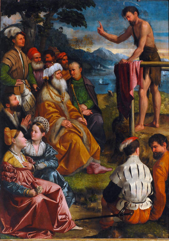 La tavola con la Predica di san Giovanni Battista presenta il santo a destra posto su un podio erboso delimitato da una staccionata in parte coperta dal manto, dalla quale si affaccia per predicare davanti a Erode, dal ricco manto bordato di ermellino arricchito da una pesante collana in oro come lo scettro ela corona sul turbante candido, Erodiade e Salomè, poste in primo piano a sinistra. Tra gli astanti Callisto ha inserito dietro Erode la figura del committente Protasio Glissate in preghiera a mani giunte, che rivela la sua grande perizia ritrattistica per la capacità di rendere l'intensità psicologica e il realismo fisionomico. A destra chiudono lo spazio due figure maschili, una di spalle con farsetto tagliato per mostrare la stoffa sottostante, secondo la moda tipica del Cinquecento, e una voltata verso lo spettatore. In quest'opera Callisto evidenzia una forte attenzione agli affetti luministici di sete e broccati, alla morbidezza degli incarnati e alla precisione delle sontuose acconciature delle due donne. Un totale pentimento è nella figura del Battista, originariamente dipinta con la testa più reclinata e con le braccia e spalle più basse. Il colore azzurro delle montagne che scolora nel grigio ricorda l'apprendistato del Piazza presso il Romanino.