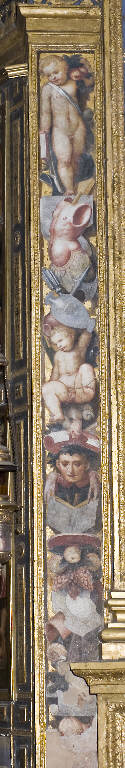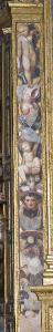 - NOTIZIE STORICO CRITICHE La seconda cappella del lato sinistro del Tempio civico dell'Incoronata è dedicata alle Storie della Passione di Cristo e testimonia sia nei dipinti sia nella decorazione ad affresco delle lesene un profondo mutamento del linguaggio di Callisto Piazza e della sua bottega. Se la teoria dei putti che giocano con la capra posta nel fregio non fornisce sostanziali novità o differenze con quanto dipinto precedentemente, sono le lesene e le paraste a presentare un'articolazione più complessa, una maggiore monumentalità e un'accentuata evidenza naturalistica degli oggetti e delle figure. Alcune teste inserite fra le targhe o la frutta si distinguono per una singolare e a volte caricaturale espressività mentre alla base emerge con illusionistica prepotenza una figura virile a mezzo busto chiusa fra due macine scorciate la cui resa caratterizzata insiema alla presenza di oggetti simbolici di difficile interpretazione, lasciano intendere che si tratti di un ritratto allusivo. Il nuovo criterio di ideazione e impaginazione di Callisto, aiutato dai fratelli Cesare e Scipione, si impone per la sua originalità, per le insistite muscolature delle figure, per il venire meno dell'impianto simmetrico che aveva caratterizzato la prima parte della decorazione e per una completa adesione al linguaggio della "maniera". Giunge a questi risultati deducendo le impaginazioni dalle incisioni di Durer e dal Pordenone, ponendo così l'Incoronata ai vertici della cultura figurativa del Ducato milanese, in antagonismo con la vicina Cremona e la presenza dominante dei Campi. Ai lati quattro tavole e al centro la tela con la Deposizione di Cristo.