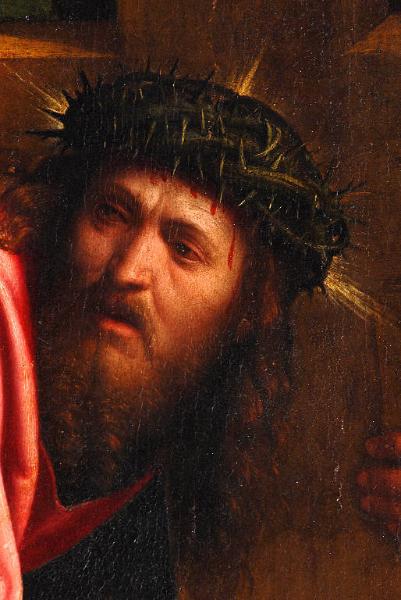 a Caduta Cristo sotto la croce è ambientata in un paesaggio. La tavola presenta riferimenti alle stampe del ciclo della Piccola Passione (1512) realizzato da Durer e dal medesimo soggetto affrescato dal Pordenone nel Duomo di Cremona. Callisto Piazza, rispetto al precedente intervento nella cappella con le Storie di san Giovanni Battista, riesce a infondere all'opera uno stile drammatico accentuato dall'affollamento delle figure in primo piano. Il nuovo linguaggio del pittore mette in luce la sua adesione alla "maniera" nelle muscolature insisitite, nei bagliori improvvisi di luce che rendono la consistenza delle stoffe, la lucentezza dei metalli degli elmi, delle spade e nel chiaroscuro accentuato, in modo particolare sulla veste e sul capo di Cristo, la cui espressione di sofferenza ben traduce questo nuovo clima. I colori diventano più smorzati, con modulazioni più cupe.