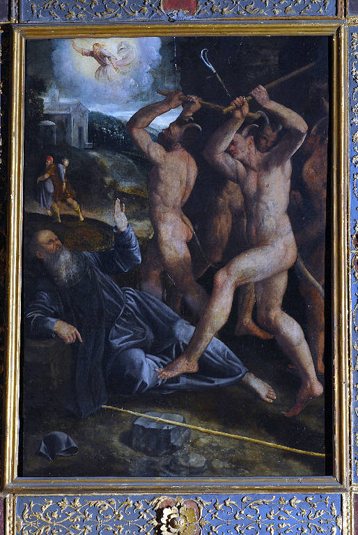 La tavola raffigura in primo piano disteso a terra Sant'Antonio abate mentre dei diavoli in forma umana, possenti e muscolosi, cercano di punzecchiarlo con dei bastoni. Sullo sfondo lo stesso santo è portato in spalla da un uomo, mentre in alto compare fra le nuvole cinconfuso di luce un altro santo; a sinistra una piccola chiesa circondata da cespugli.