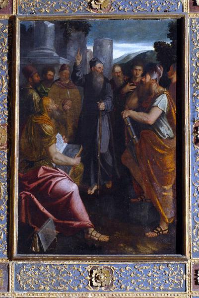 La tela presenta al centro Sant'Antonio abate mentre predica, indicando il cielo con la mano destra, ai pagani elegantemente abbigliati nei manti preziosi. Alcuni di loro tengono dei libri, mentre i volti, dall'espressione intensa, sono rivolti al protagonista. Il paesaggio è formato da colonne spezzate che simboleggiano la caduta del paganesimo sotto il cristianesimo, punteggiate da alberi.