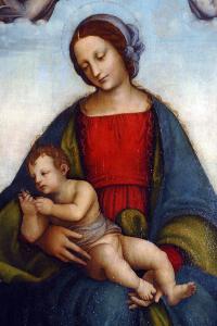 Il pannello centrale del registro inferiore raffigura la Madonna con Gesù Bambino, sdraiato sulle sue ginocchia e nelle mani un pettirosso, incoronata da due angeli, posti in un paesaggio appena accennato e semplicemente riempitivo dello spazio. Stilisticamente la figura di Maria rivela un forte contatto con l'arte centroitaliana, con quel protoclassicismo peruginesco nella soavità del volto e nella gestualità contenuta, anche se la posa sembra derivare dalle Madonne leonardesche sul genere della Pala Sforzesca.