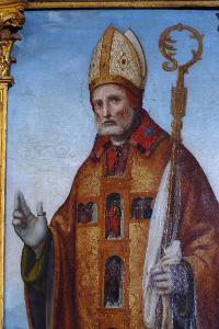 Il laterale destro del registro inferiore raffigura San Bassiano, patrono della città di Lodi, ben riconoscibile per la pianeta istoriata, la mitria e il pastorale. E' in piedi, benedicente, poggiante su un terreno erboso e con un accenno di paesaggio che completa il pannello. Sulla pianeta in broccato dorato con un ricamo centrale formato da nicchie prospettiche con colonnine tortili che si dispongono secondo una croce, si identificano in alto e verticalmente: San Giovanni Battista accostato a Santa Caterina d'Alessandria di cui si scorge parte della ruota, al centro San Paolo con la spada del martirio, ai lati l'Annunciazione, sotto San Paolo la nicchia con San Pietro con le chiavi del paradiso, poi un santo non identificabile, un santo vescovo e infine San Rocco. Stilisticamente la figura del santo patrono rivela un contatto con l'arte centroitaliana, con quel protoclassicismo peruginesco nella soavità del volto e nella gestualità contenuta, cronologicamente vicina al San Bassiano proveniente dalla chiesa parrocchiale di Turano Lodigiano e oggi conservata al Museo civico di Lodi.