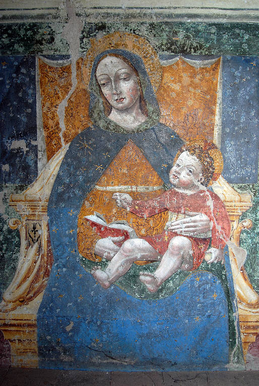L'affresco posizionato all'interno della cantoria, raffigura la Madonna, con una veste in broccato dorato sormontato da un manto blu punteggiato di stelle, con il Bambino coperto da una vestina rossa con alta fusciacca in vita, entrambi seduti su un trono marmoreo con braccioli a delfini e spalliera coperta da un drappo dello stesso tessuto dell'abito di Maria. Dietro al capo le due aureole in parte prive della doratura rivelano una decorazione a punzone tondo e a raggiera, quella di Gesù arricchita dal segno rosso della croce. Il dipinto murale appare oggi tagliato in orizzontale, in seguito al progetto realizzato nel 1538 quando, secondo il Cernuscolo si commissiona la cantoria che nell'ornato dovrà essere simile a quella dell'organo.