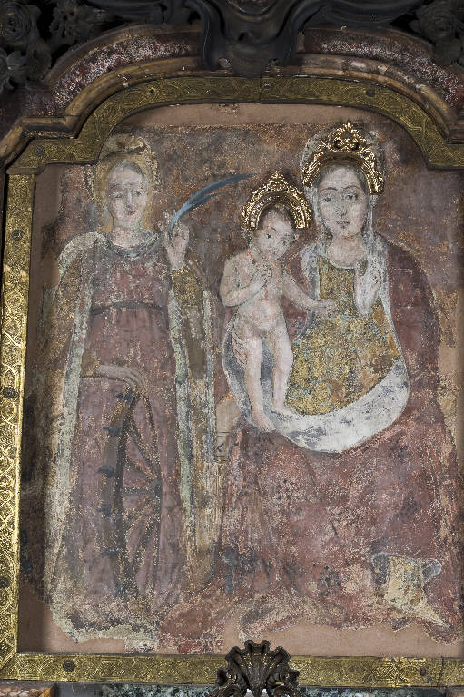 Incastonato nella parte anteriore dell'altare vi è un affresco che raffigura la Madonna con Bambino in trono con accanto Santa CAterina d'Alessandria con la palma e la ruota del suo martirio. L'affresco è stato staccato e profilato con cornice in legno dorato e modanato nella parte superiore; aureole in metallo dorato sul capo della Madonna e del Bambino