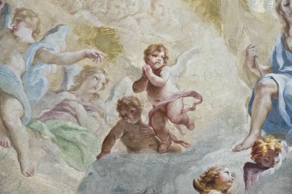 L'affresco presenta al centro della scena Cristo che regge una corona di rosa e accanto Dio Padre con una di stelle, mentre guardano la Vergine inginocchiata sulle nubi, il viso rapito rivolto verso l'alto. Dietro il capo una sottilissima aureola. La circondano gli angeli musici o che reggono le rose, i fiori dedicati a Maria. Alcuni reggono le nubi candide e soffici su cui poggia Maria, oppure giocano con il manto nascondendosi sotto. Il moto ascensionale verso l'alto, le pose serpentinate degli angeli, i colori luminosissimi e i toni pastello, ma anche una pennellata liquida con tocchi di cangiantismo, si pongono quale preludio allo sviluppo della pitura Rococò.