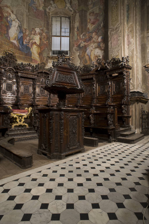 - NOTIZIE STORICO CRITICHE Il leggio, completamento naturale del coro ligneo, venne scolpito a cominciare dal 1699, cioè immediatamente dopo la decorazione ad affresco dell'abside come rivela il lato sinistro che sormonta parte delle quadrature, da Carlo Antonio Lanzani, fratello del pittore Andrea, realizzando un capolavoro di ebanisteria.