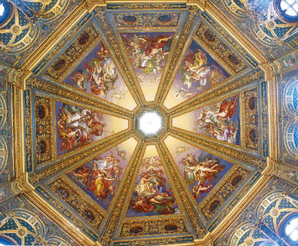 Cupola di forma ottagonale divisa in otto spicchi da profilature a candelabra dorate su fondo blu che riprendono la primitiva decorazione della chiesa, oculo centrale ottagonale e conclusione esterna con la lanterna; tamburo con stessi motivi decorativi e due oculi circolari per ogni spicchio.
