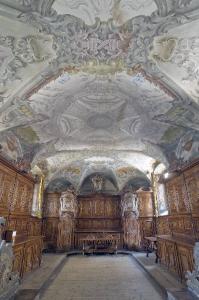 - NOTIZIE STORICO CRITICHE La sacrestia nuova, chiamata così per distinguerla dal primo locale adibito a questo scopo e posto a fianco della zona absidale, presenta una decorazione a quadrature a monocromo grigio che si dispone per tutta la superficie, con finta cupola centrale che appare prospetticamente schiacciata e poco corretta. Si aprono nelle zone angolari delle conchiglie che accolgono al loro interno dei mazzi di fiori policromi.