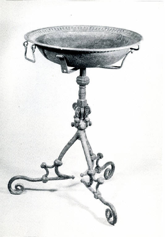 - NOTIZIE STORICO CRITICHE Il braciere liturgico venica usato durante le celebrazioni della Settimana Santa per la benedizione del nuovo fuoco. Ascritto al XVIII secolo, secondo la Venturelli va invece con tutta probabilità riconosciuto nel "trippè" di "ferro con uno bacilone di rame che si adopera per la foghera", presente in sagrestia dal 1634, accompagnato da un altro "trippè di ferro con sua foghera", sempre "di rame", ma più "picolo".