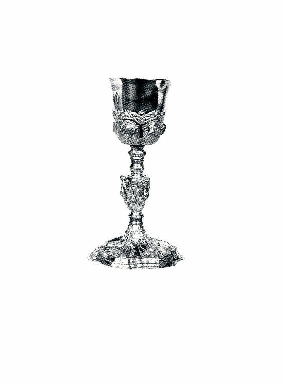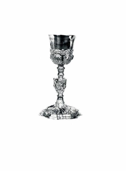 - NOTIZIE STORICO CRITICHE Sulla coppa è presente il bollo dell' "incudine", sul bordo del piede si notano il marchio territoriale di Milano, "aratro di profilo" e quello relativo al tenore dell'argento contenuto, un ettagono includente il mondo e sette stelle, apposti dall'ufficio di convalida degli oggetti d'argento e metalli preziosi, operante a Milano dal 1812 (a seguito dell'editto del 1810 emesso da Eugenio Beauharnais). Nelle risultanze formali già aperte alle istanze barocchette, il calice richiama decisamente l'esemplare proveniente dalla chiesa di Sant'Alessandro di Barzio (Lecco) e ora al Museo Diocesano di Milano, datato 1688, donato dal parroco della chiesa Giulio Cesare Baroverio, un manufatto da collegare a sua volta a un altro calice conservato nel comasco, datato 1686.