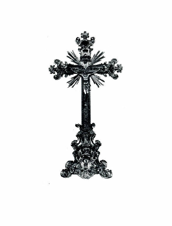 - NOTIZIE STORICO CRITICHE Ritenuta opera di inizio Settecento, la croce, secondo Paola Venturelli, pare meglio inquadrabile in un contesto a cavallo tra il XVII e il XVIII secolo, come invitano a ipotizzare le sagome a ricciolo appiattito dei montanti ai lati del basamento corredate da vistosi vasi fioriti (quello a destra lacunoso), con la base modanata di legno tinto in ebano, nell'ambito di una produzione lombarda, già in epoca barocca impegnata a realizzare opere con inserti di lamine in tartaruga.