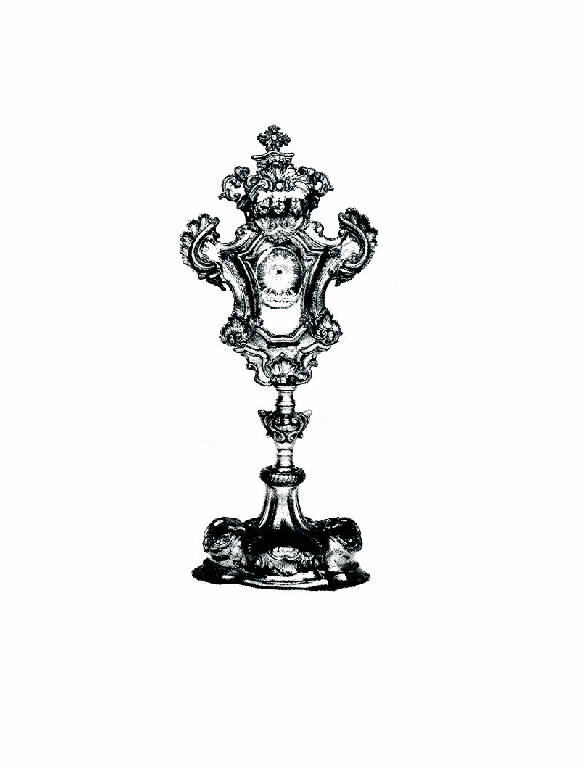 Il reliquiario ad ostensorio presenta piede a sezione ellittica mistilinea con colletto liscio espanso, con partiture costituite da quattro gonfie sporgenze ornate da cartelle crestate che salgono raccordandosi all'innesto del fusto, formato da una corona baccellata; il nodo è a vaso con sporgenze nella parte superiore. Teca dai profili mistilinei formati da creste ondose, fogliami e cornicioni spezzati, culminanti in un fastigio a baldacchino timpanato; vite moderna interna. La mostra contiene reliquie della Vergine Maria e dei santi Giuseppe, Bassiano, Alberto, Tiziano, Savina. Il reliquiario che reca sacri resti di santi venerati a lodi (Bassiano, Alberto, Tiziano), conserva nel rovescio del piede il cuneo ligneo per la contrappesatura dell'oggetto.