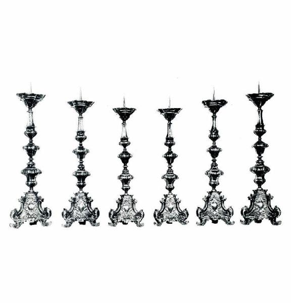 I diversi esemplari, di differenti altezze, ma identiche soluzioni formali, presentano una base a sezione triangolare con tre specchiature dai profili mossi e medaglione centrale vuoto, retta da piedini a ricciolo. Il fusto si articola attraverso la successione di nodi a ghianda e vasiformi ornati dal motivo di costolonature verticali che percorrono anche il piattello, a calice, caratterizzato da margini ondulati.