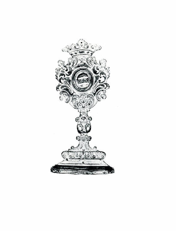 - NOTIZIE STORICO CRITICHE Il reliquiario, di fattura piuttosto corsiva, contiene una teca ellittica nella mostra con frammenti dei sacri resti delle sante Apollonia, Lucia, Agata, che è stata assegnata ad un momento piuttosto avanzato del XVII secolo. Tuttavia, l'imposto irrigidito e speculare con cui è riletto il consueto repertorio barocco (che sopravvive nei manufatti ad uso liturgico sino al XX secolo), con la soluzione proposta per il fusto, imitante il motivo "a lira" tipico del Neoclassicismo di primo Ottocento, fa propendere per un'assegnazione al XIX secolo.