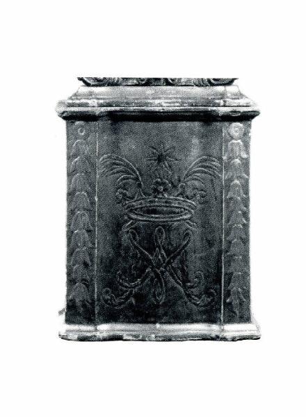 A sagoma di alto parallelepipedo sagomato, presenta la faccia anteriore decorate con lo stemma della basilica dell'Incoronata rinserrato da due lesene percorse da una successione di corolle stilizzate; i fianchi sono ornati da elementi fitomorfi stilizzati.