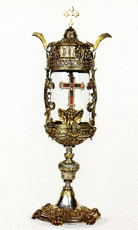 Sostegno a sezione circolare con alto collo ad imbuto chiuso da un motivo a corolla di foglie, ornato da racemi rilevati; nodo ' a ghianda con calotta e base decorata da elementi fitomorfi e conchiglie stilizzati; base del ricettacolo e il coperchio con cupolino architettonico sono ornati da un fitto formulario decorativo. I fiancali della teca cilindrica, in vetro, sono risolti con una successione di onde vegetali. Sul piede, sulla base della teca sono applicate teste cherubiche, mentre du rami di palma corredano il coperchio e una crocetta apicale con terminali trilobati sigla il coperchio. All'interno è sistemata la croce reliquiario (con un frammento del Sacro Legno) con una doppia testa di cherubino ottenuta a fusione.