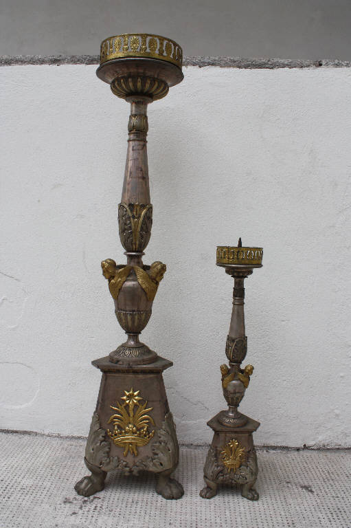 Base a sezione triangolare poggiante su zampe leonine; reca simbolo dell'Incoronata; nodo a vaso corredato da teste cherubiche applicate e aggettanti