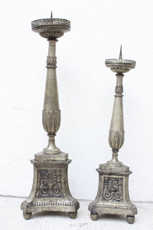 Base a sezione triangolare poggiante su piccole sfere decorata con palmetta; fusto fogliato rastremato verso l'alto; portacandela circolare traforato