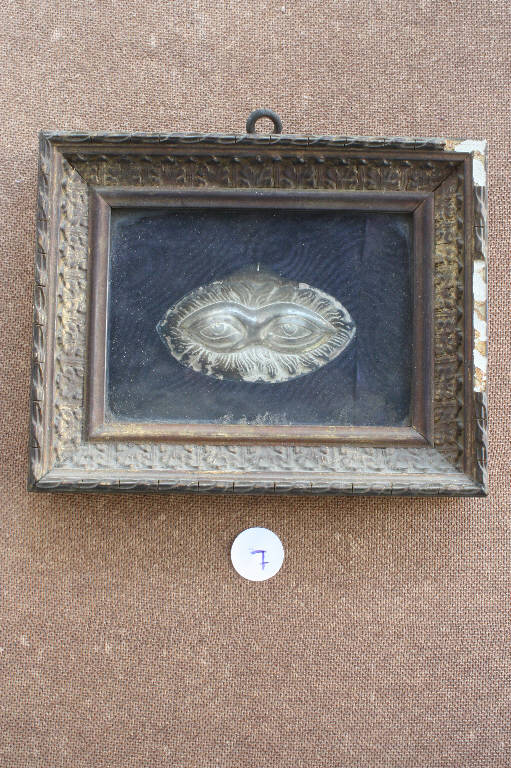 Raffigurante due occhi umani, contornati da una cornice fiammeggiante. Su seta blu e incorniciato.