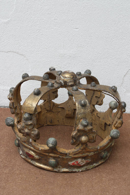 Corona per statua con base circolare merlata sormontata da sfere, anse raccordate al nodo centrale sormontato da una sfera dorata con base fogliata e piccole sfere