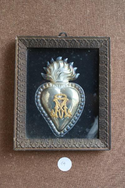 Bordo perlinato e cuore fiammeggiante conservato in teca incorniciata con cornice lignea