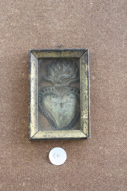 Cuore dal bordo perlinato le fiamme posizionate nella parte superiore; conservato in teca incorniciata con cornice lignea argentata