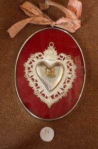 Cuore con bordo con perline alternate a fiori, con bordo esterno con fiori e foglie nastriformi stilizzate, testa cherubica; conservato in teca incorniciata da una cornice metallica