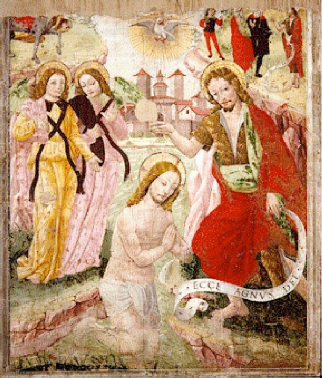 • NOTIZIE STORICO CRITICHE L'affresco strappato proviene dalla cappella di S. Giovanni Battista, la seconda del lato destro, e appartiene alla prima fase decorativa dell'Incoronata, prima, cioè, dell'avvento della famiglia Piazza. I riferimenti stilistici di questo affresco rivelano evidenti componenti bergognonesche: dalla colomba dello Spirito Santo ripresa specularmente da quella dipinta nella tavola lodigiana dell'Annunciazione, oppure la posa di Cristo replicata dal Bergognone nella tavola conservata nella chiesa di San Giovanni Battista a Melegnano.