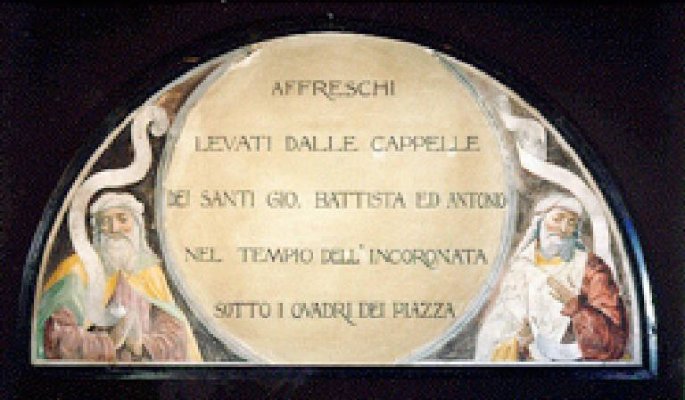 Affresco con due profeti dai lunghi cartigli e al centro una iscrizione inserita in una forma circolare che ricorda sia l'oculo della finestra della cappella sia la loro precedente collocazione