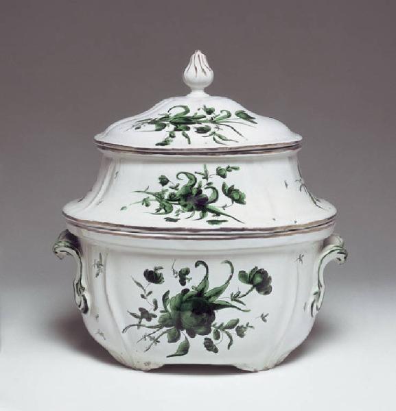 Zuppiera di grande eleganza sia per la forma, prettamente rococò, sia per il decoro. E' composta di tre elementi: il recipiente di base con funzione di zuppiera, un elemento sovrapposto per tenere calde le vivande e il coperchio. Il corpo della zuppiera poggia su quattro bassi piedi dai quali partono quattro modanature che salgono fino all'orlo per poi continuare sulla parte mediana e sul coperchio. Sull'orlo a forma di anello poggia la larga base dello scaldavivante il cui corpo va fortemente rastremandosi verso la bocca. Il coperchio, leggermente bombato, ha una presa a forma di pigna. Le anse sono a rocaille profilate di verde. Su tutte le parti sono distribuiti mazzetti di fiori in brillante verde smeraldo, profilati in manganese.