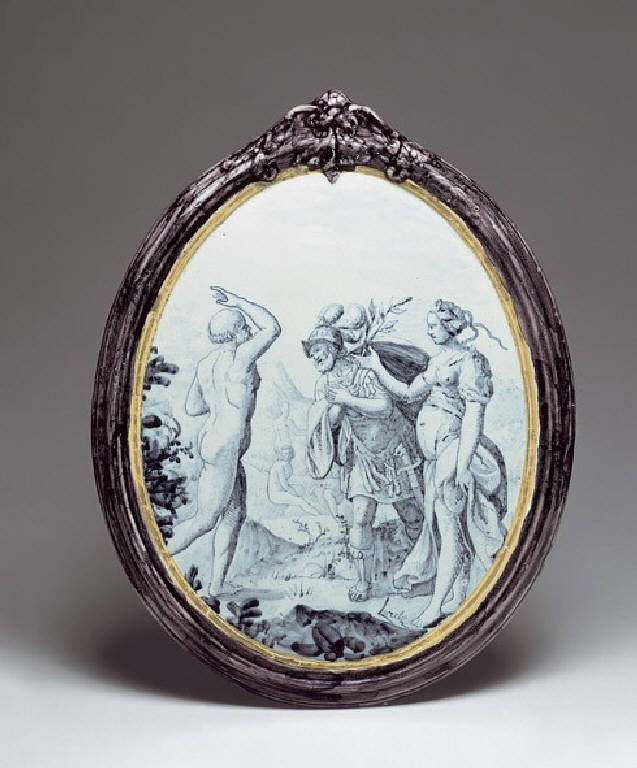 Ambrogietta ovale profilata da una cornice liscia in manganese scuro, terminante con una fastigio fitomorfo. Racchiude una scena tratta dal VI Libro dell'Eneide, con Enea accompagnato dalla Sibilla che incontra l'ombra di Anchise nei Campi Elisi. In secondo piano altre ombre sono poste oltre un fiume "in una verde valle" fra bassi colli.