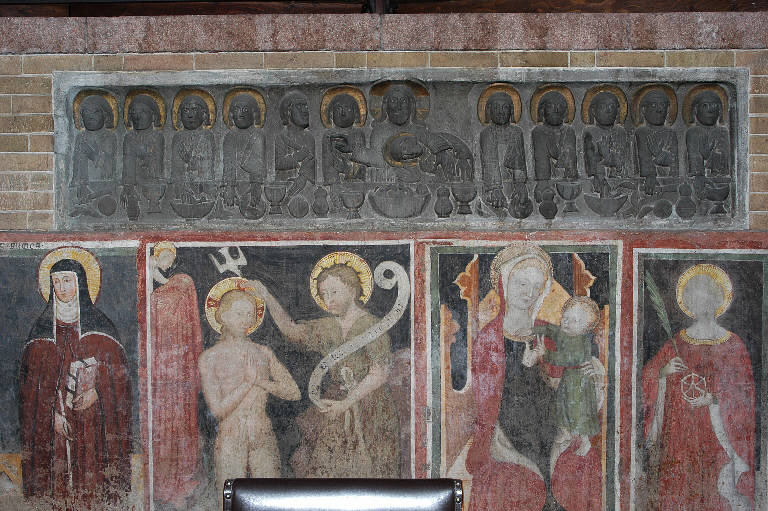 Il setto murario che conduce alla cripta si presenta come un palinsesto di opere differenti. In alto il rilievo con l'Ultima Cena mentre nella parte inferiore si susseguono degli affreschi senza continuità logica. A partire da sinistra: un frammento di santo Vescovo; Santa Erica, monaca dell'ordine della clarisse; il Battesimo di Cristo; alcune Madonne con il Bambino, Santa Caterina d'Alessandria indentificabile per la ruota e la palma del martirio. Accanto alla porta di destra si distacca il frammento rinascimentale con San Giovanni Battista e un donatore.