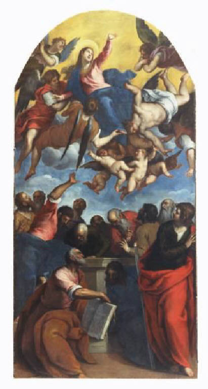 - NOTIZIE STORICO CRITICHE Il dipinto viene commissionato da Alessandro Cattaneo quale pala d'altare della cappella dell'Assunta nella chiesa di Sant'Agostino. Alessandro Cattaneo era membro di una nobile famiglia cremasca ed era esponente di rilievo nel contesto cittadino, tanto che dal 1603 è membro del Consiglio e dal 1608 assume la carica di Provveditore e, come ambasciatore, nel 1607 si recò a Venezia presso il Doge Priuli. Nel febbraio 1599 nella chiesa di Sant'Agostino Cattaneo acquisisce il patronato della seconda cappella del lato destro, intitolata alla Visitazione, e modifica in cappella dell'Assunta, dotandola intorno al 1607/1610 di una nuova pala d'altare. Gli incarichi pubblici da lui rivestiti sono probabilmente all'origine della commissione dell'opera ad un pittore veneto come Jacopo Palma. Nel 1797 in seguito alla soppressione della chiesa e del convento di Sant'Agostino il dipinto passò all'Ospedale di Crema.\nIl dipinto trae qualche spunto nella struttura compositiva dall'Assunta di Tiziano in Santa Maria dei Frari a Venezia, si veda il braccio alzato dell'apostolo che diviene elemento di collegamento tra il mondo terreno e il mondo celeste.\nLa datazione del dipinto è stata oggetto di discussione da parte della critica: 1610 ca. secondo Ivanoff e Zampetti per via delle similitudini con l'Assunta di Noale, 1620 per Mason Rinaldi in virtù dell'appiattirsi della spazialità, dell'addensarsi delle figure e le fisionomie stereotipate, datazione di poco anticipata da Alpini.