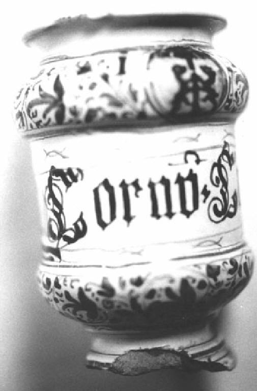Alberello di farmacia con orlo espanso, corpo a rocchetto, piede sagomato. Colori: blu su fondo bianco.
