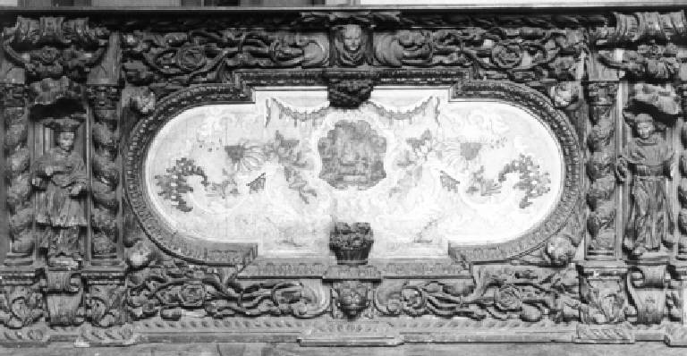 Paliotto d'altare ligneo con fitte decorazioni ad altorilievo e decorazione centrale policroma.
