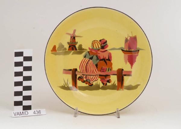 Piatto fondo circolare privo di tesa; fondo giallo decorato con paesaggio olandese in rosa, arancio, marrone, azzurro e verde; bordo rifinito con filettatura nera.