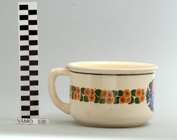 Pitale cilindrico con manico rettangolare; fondo bianco con motivo decorativo floreale in verde, ocra, rosa, azzurro e marrone all'esterno.
