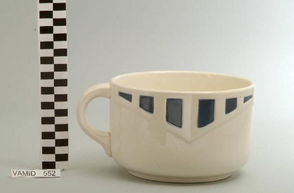 Pitale di forma circolare con manico a "C"; fondo bianco con motivo decorativo geometrico a riquadri blu in rilievo.