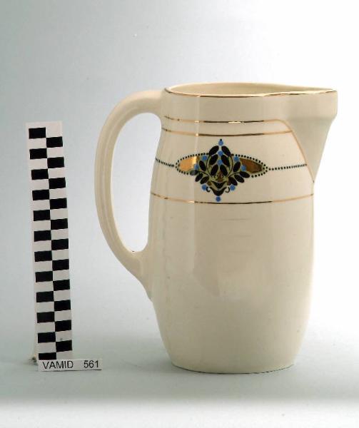 Brocca cilindrica con manico, decorata con motivo in nero, verde acqua, azzurro e oro brillante ripetuto su due lati; rifiniture in oro brillante lungo la fascia e lungo l'imboccatura.