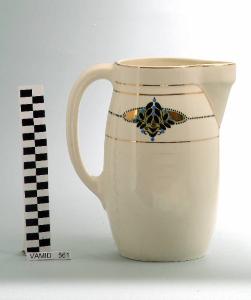 - NOTIZIE STORICO CRITICHE La brocca fa parte di un servizio igienico da camera composto da due elementi (nn. inv. 561, 2337). La decorazione, applicata sottosmalto, è stata eseguita con la tecnica del transfer print. Le rifiniture in oro brillante lungo la fascia e il bordo sono state eseguite soprasmalto.