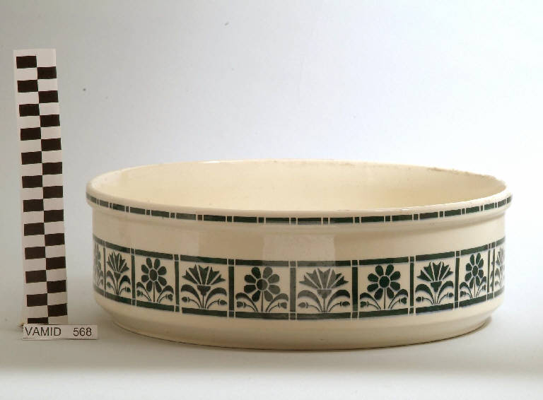 Catino lavamano con corpo cilindrico; fondo color avorio decorato con motivi geometrici e floreali in verde all'esterno.