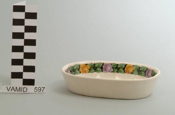Portasapone di forma ovale; fondo color avorio con motivo decorativo floreale (foglie e rose) in giallo, viola e verde all'interno.