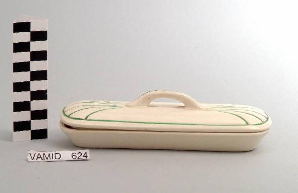 Portasapone con corpo allungato; coperchio ovale con presa apicale; fondo color avorio con scanalature e profili rifiniti in verde.
